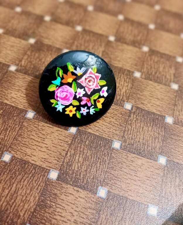 Black flower painted wooden ring with resin varnished.