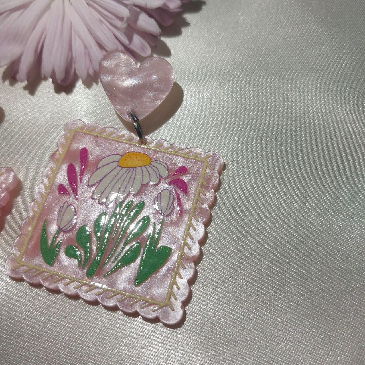 Adorn your ears with charming square pendants featuring hand-painted daisies and pink tulips . Delicately connected to soft pink heart-shaped studs for a romantic floral touch .