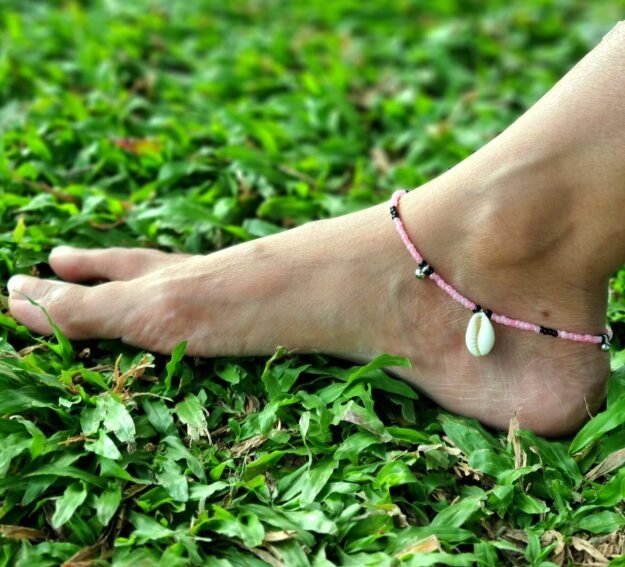 This handmade anklet is crafted from colourful beads, cowrie shells & metal charms. It makes your feet shine with personality!