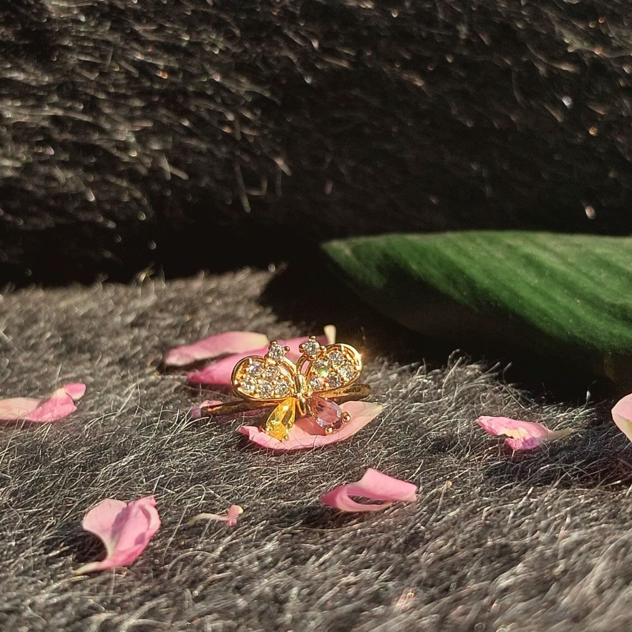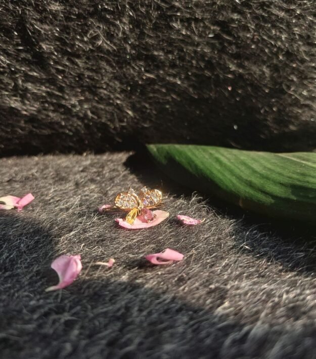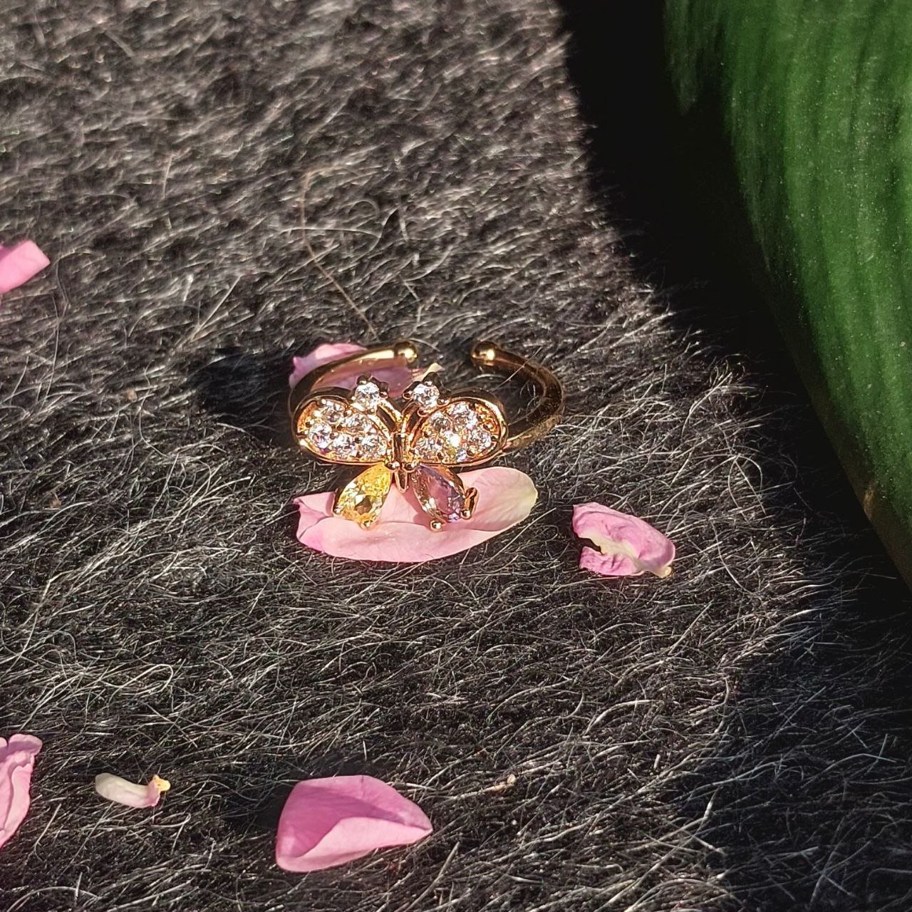 A delicate butterfly rests gracefully atop a soft floral bloom, symbolizing transformation and gentle beauty. Finished in radiant gold tones with shimmering crystal accents. A statement of quiet elegance for everyday charm or special moments.