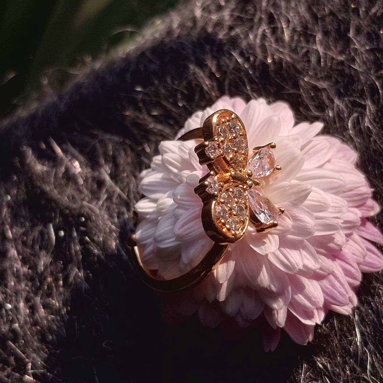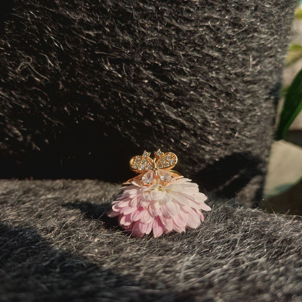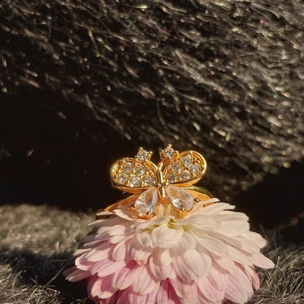 A delicate butterfly rests gracefully atop a soft floral bloom, symbolizing transformation and gentle beauty. Finished in radiant gold tones with shimmering crystal accents. A statement of quiet elegance for everyday charm or special moments.