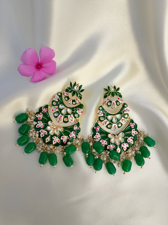 A timeless pair of statement earrings featuring refined Minakari detailing accented with classic Kundan stones. The design is completed with elegant Gajra-inspired drops, adding graceful movement and depth. Finished in a rich gold tone, perfect for festive and occasion wear.