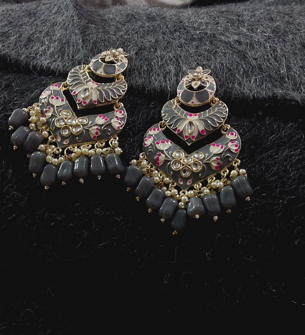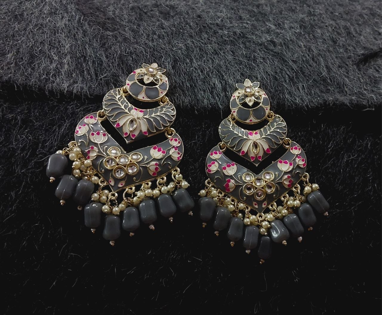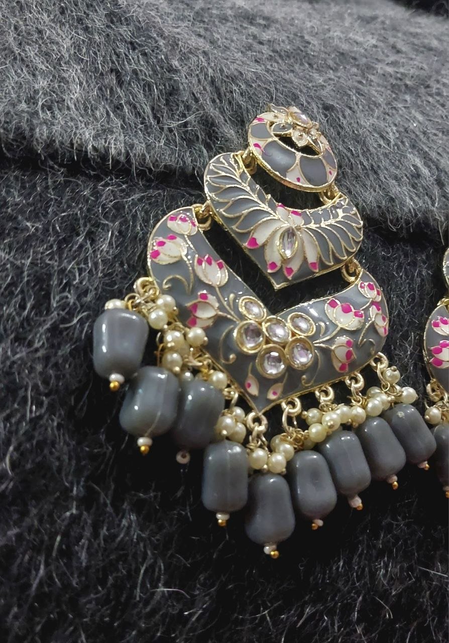 A timeless pair of statement earrings featuring refined Minakari detailing accented with classic Kundan stones. The design is completed with elegant Gajra-inspired drops, adding graceful movement and depth. Finished in a rich gold tone, perfect for festive and occasion wear.