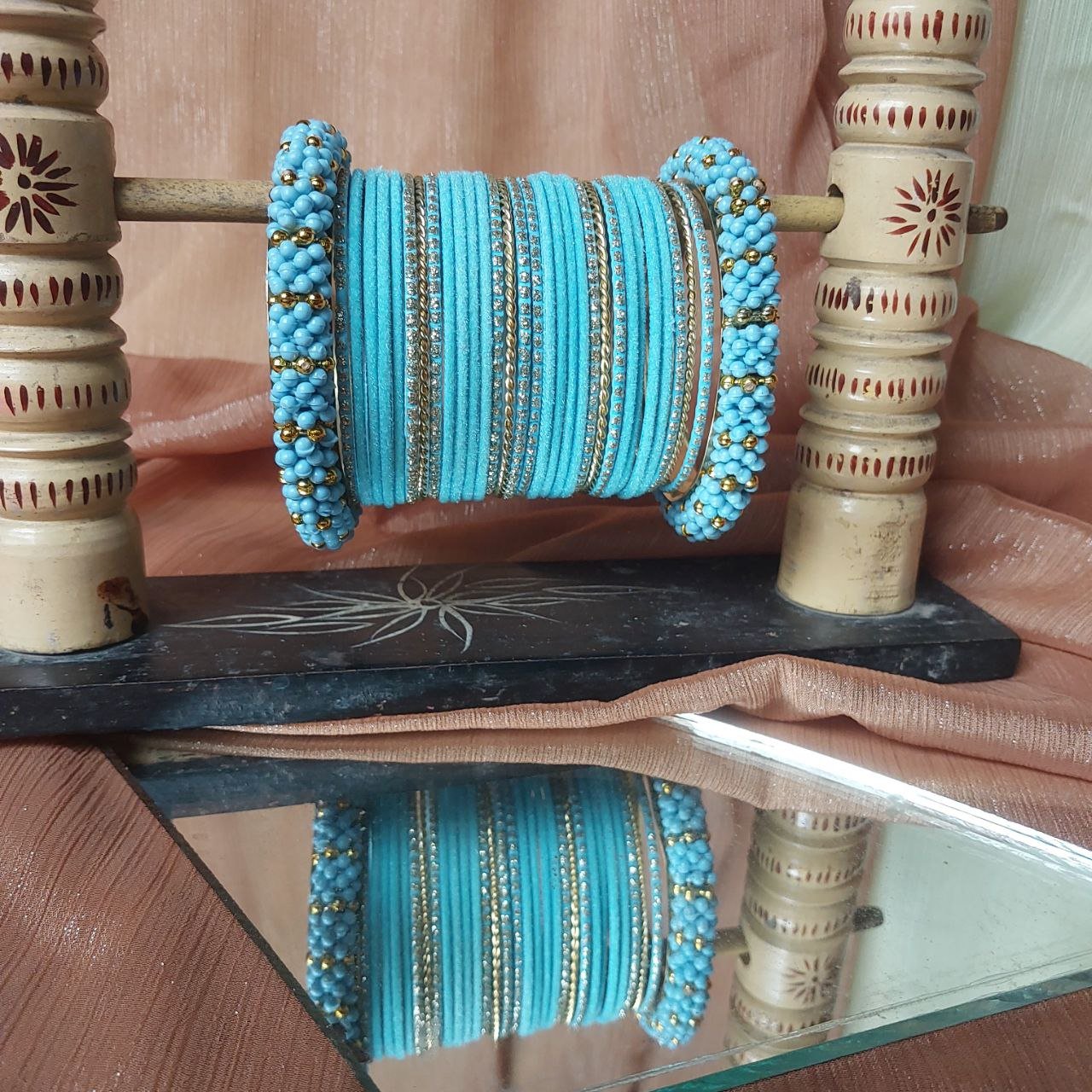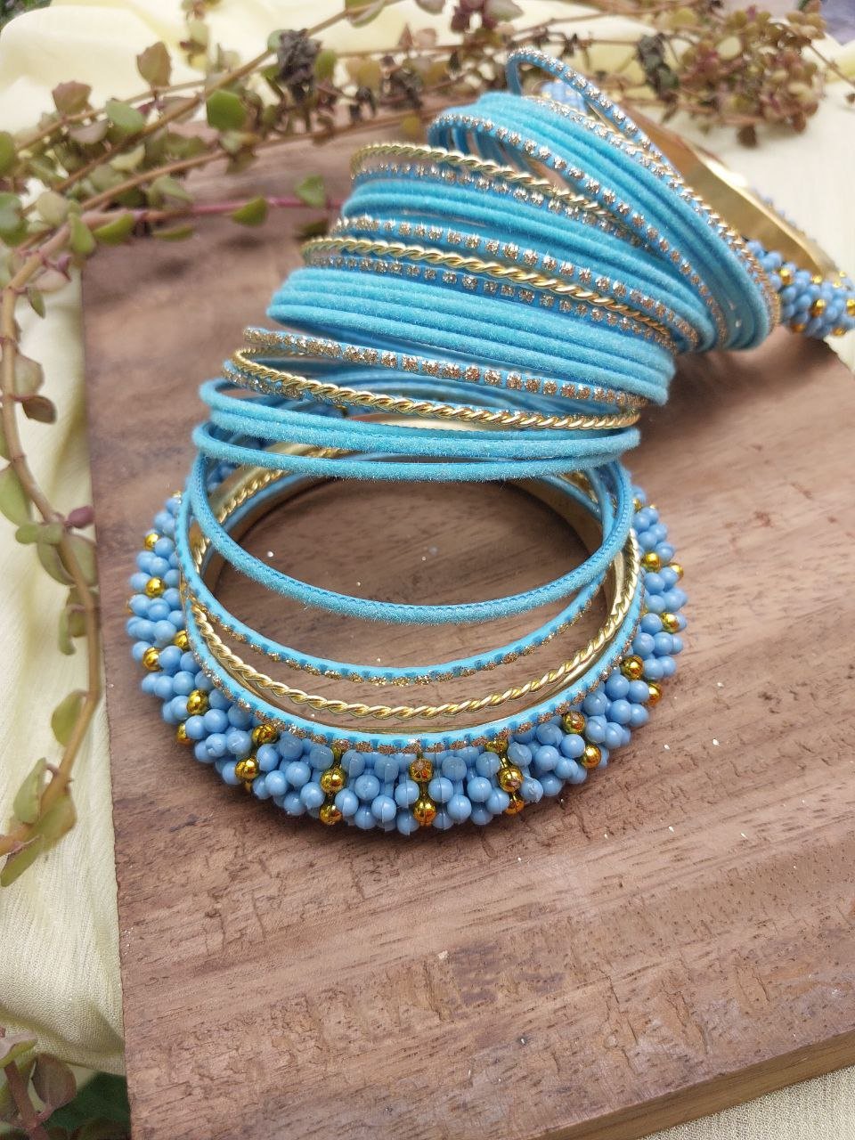 A serene blend of sky-blue hues and golden accents, designed to add effortless charm to your look. This bangle set brings a soft pop of color with a touch of sparkle for everyday or festive wear. Perfect for stacking or styling solo, it’s a graceful statement of modern tradition.